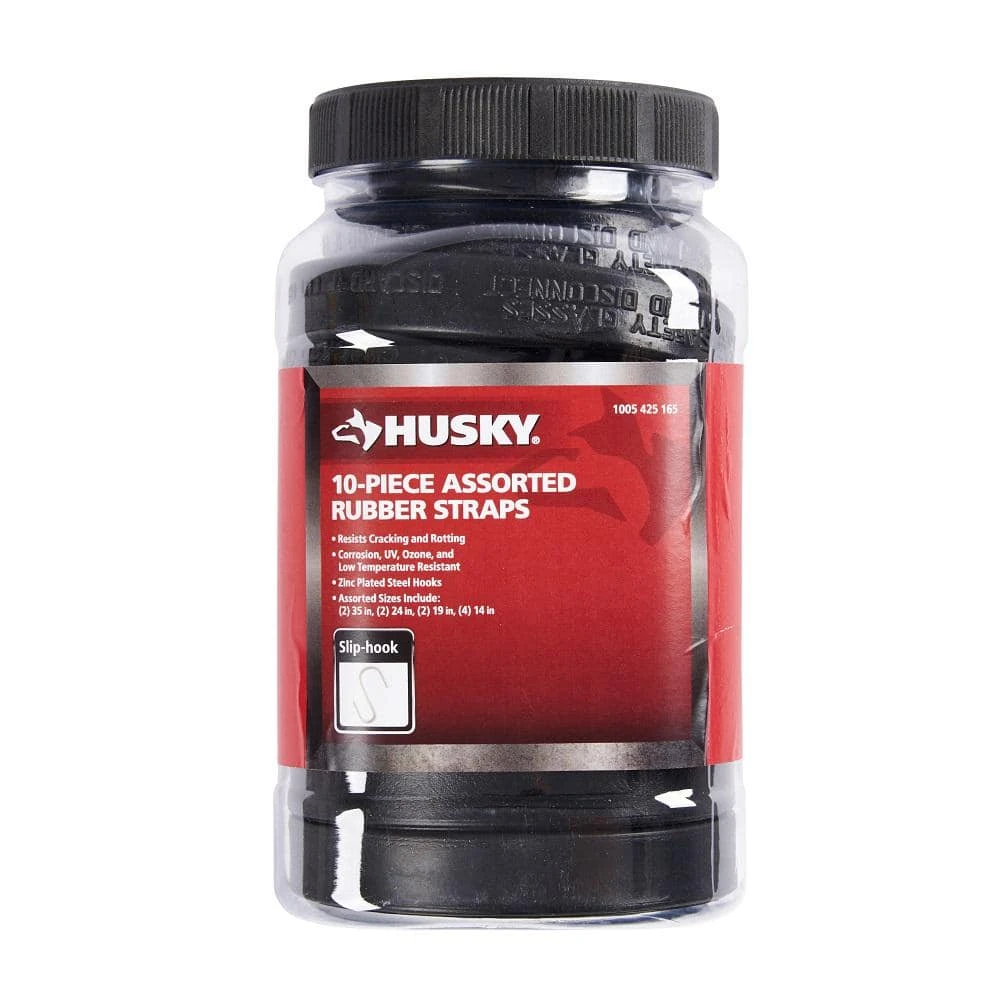 The Husky Assorted EPDM rubber straps are constructed from quality materials for superior strength and durability. The rubber Ethylene Propylene Diene Monomer thick synthetic compound ensures the strap remains non-brittle in temperatures as low as -40°F, high temperature, and demanding elements to be used all year-round. Zinc-plated, steel hooks resist corrosion and do not bend, break, or rust as easily, making Husky EPDM Rubber Straps the best choice when it comes to your securing your valuables. It is available in a convenient 10-pack in various lengths, perfect for small light-duty applications. Use straps to bundle items, or in tandem to keep larger items in place.