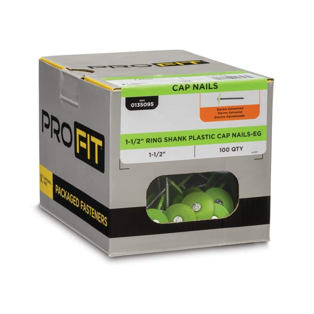 Use PRO-FIT cap nails to secure building envelope and better protect roof decks and sidewalls from moisture. The 1″ cap provides greater holding power than a nail or staple alone, making them a viable option for residential and commercial settings. Plus, the ring-shank nail secures the fastener into the wood. PRO-FIT cap nails are packaged as a unit, making them easy to grab and go on the job. Hand-driven plastic caps secure roofing underlayment, housewrap, and insulation to wooden roof decks.