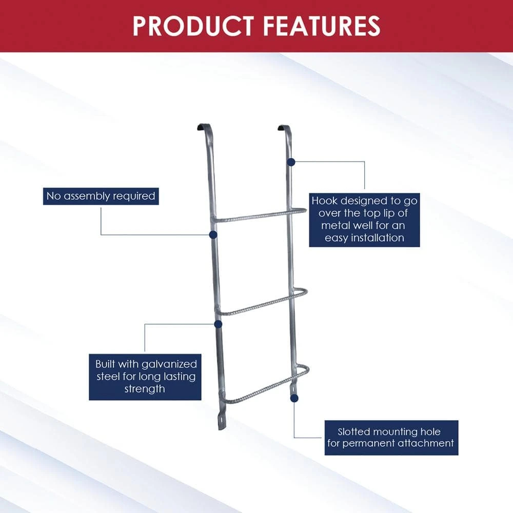 Shape Products 3-Step Steel Window Well Escape Ladder is designed for 4 ft. metal egress window wells. Made from galvanized steel for maintenance free, long lasting strength. Installation is quick and easy with a hook designed to go over the top lip of a metal well and slotted mounting holes for permanent attachment. No assembly required.